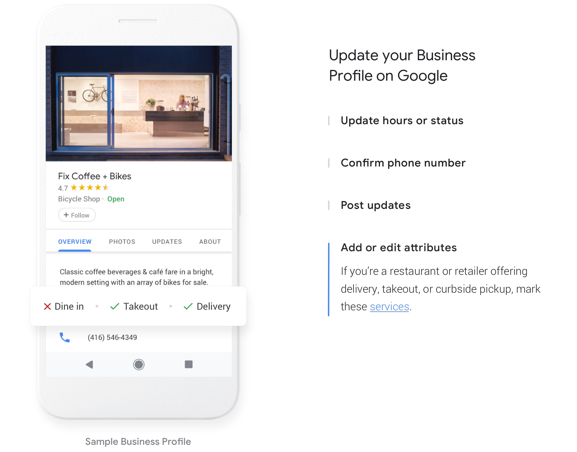 - Today people are deciding where to grab food not only based on the menu, but also on how easy it is to pick up safely. We added attributes like “curbside pickup,” “no contact delivery,” and “dine-in” so that restaurants can easily share these important details on their Business Profiles in Search and Maps. Since March, more than 3 million restaurants have added or edited their dining attributes. Some restaurateurs are even ditching dining areas for good.